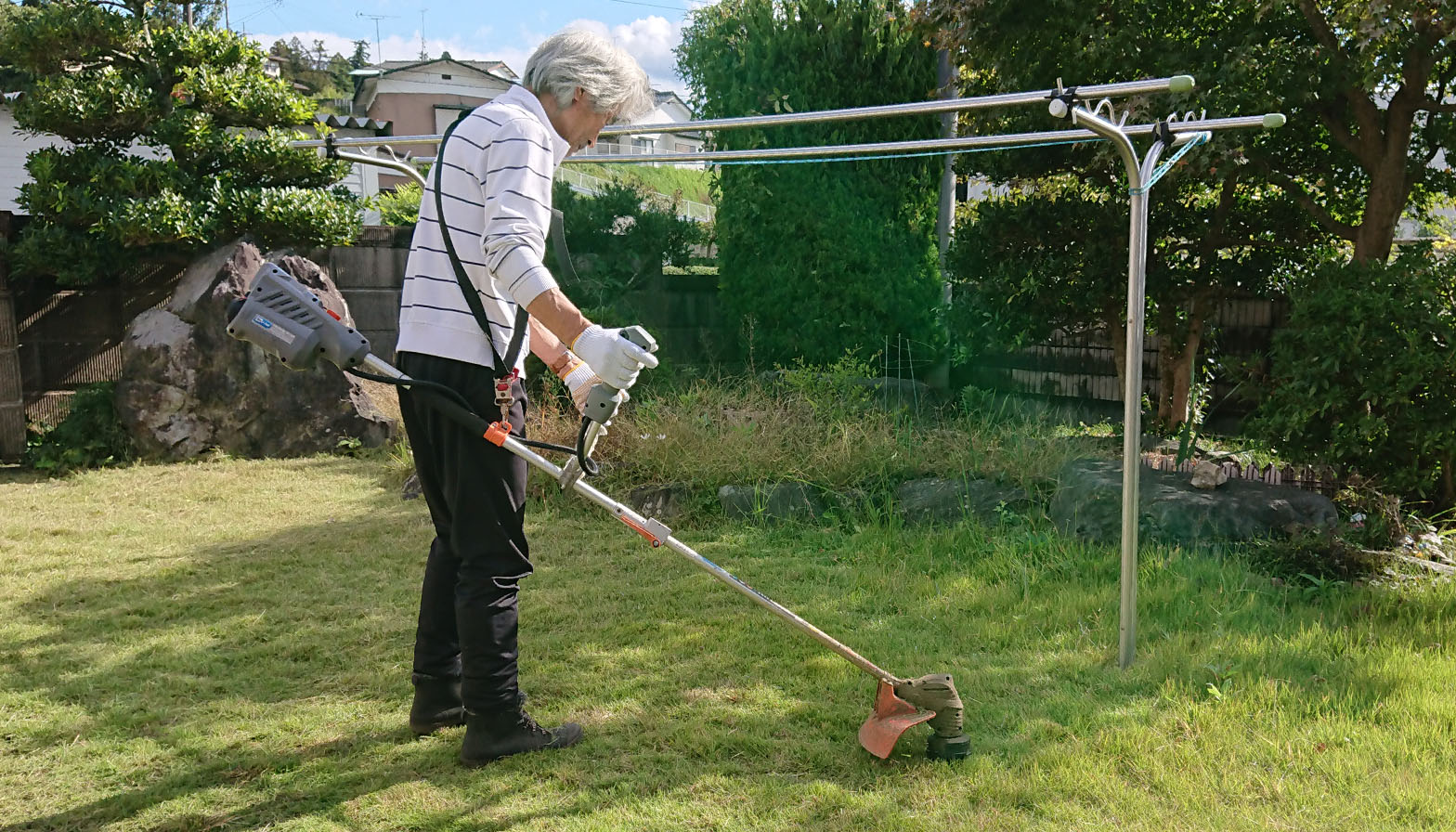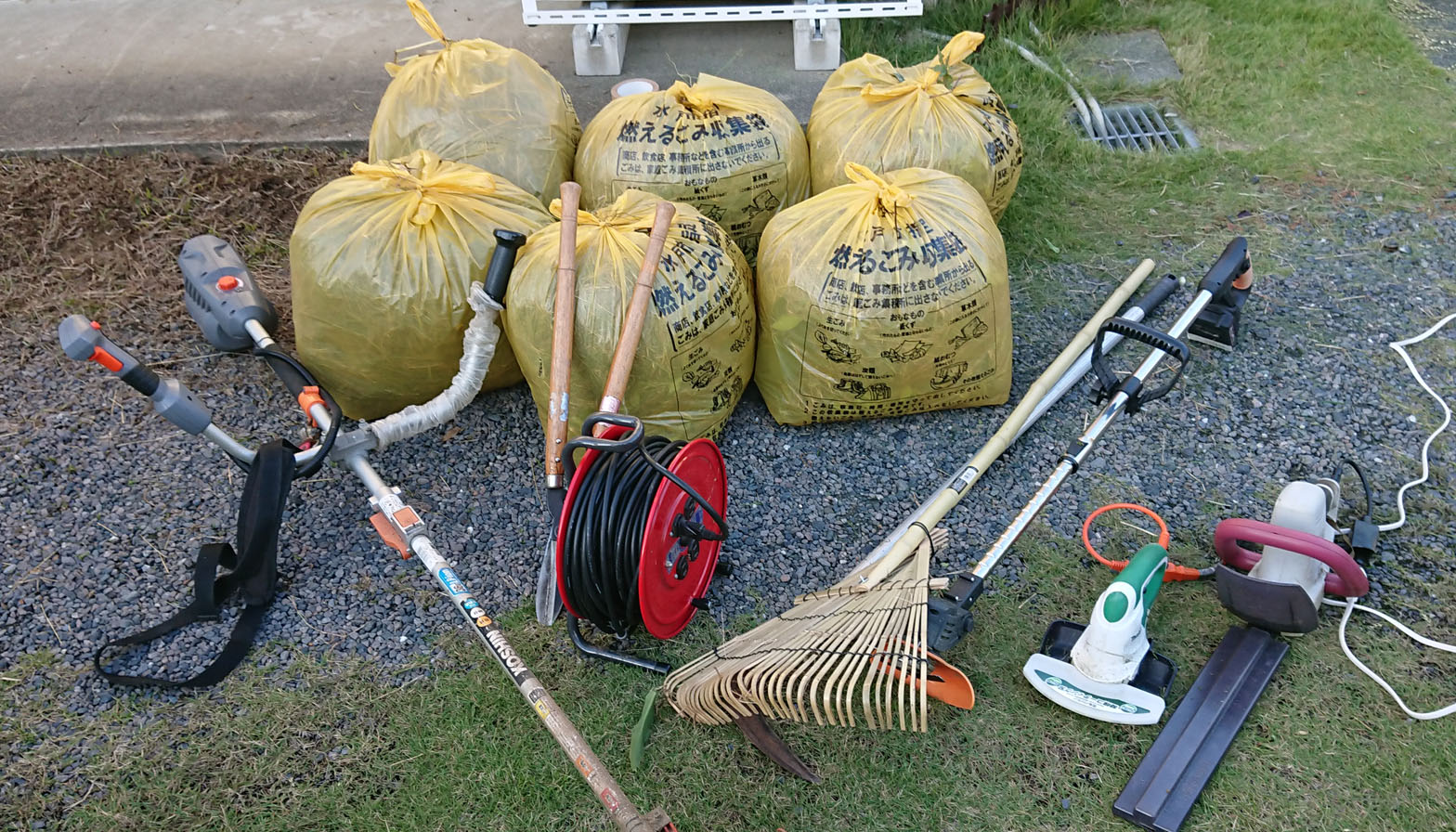 お客様の指定で朝10時にお伺いいたしました。電話での打ち合わせで物置に道具があるので使用可能とのことで一部利用させていただきました。